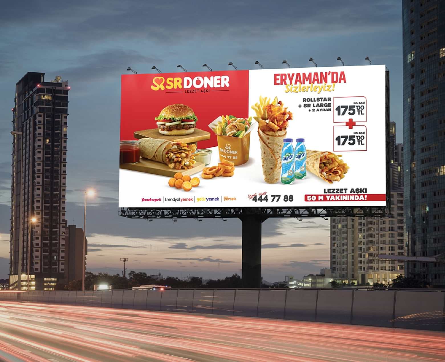 SR Döner, yıllardır değişmeyen özel sosları ve taze sebzelerle marine edilmiş eşsiz dönerleriyle karşınızda! Çarpıcı billboard tasarımımızla, lezzet tutkunlarının ilgisini çekiyoruz. Her lokmada damak çatlatan lezzet yelpazesiyle, SR Döner’in büyüleyici tadını doğrudan hedef kitleye ulaştırıyoruz. Lezzet aşkı sokaklarda!